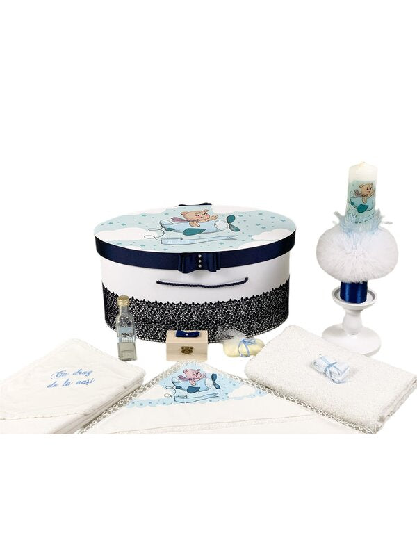 Toate aceste elemente sunt prezentate intr-o cutie speciala, cu capac transparent, care pune in valoare fiecare detaliu si adauga un plus de rafinament si originalitate momentului special al botezului.