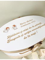 - Cufar mare, alb, cu perlute. Cufarul are bentita maro pe capac si fundita. Pe baza cufarului este aplicata dantela maro. Cufarul este personalizat cu ingerasi, numele, data nasterii si un mesaj.
