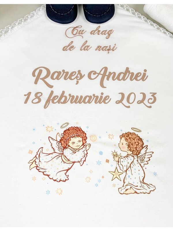 - Prosopul bebelusului cu un ingeras brodat si personalizat cu numele si data nasterii.