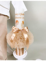 - Lumanarea pentru botez confectionata din ceara alba si este accesorizata cu tul, fundita maro si presonalizata cu ingerasi, numele si data nasterii.