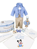 Pret unitar pe- Costumul albastru deschis, confectionat cu mare atentie la detalii si din materiale fine, adauga un aspect rafinat si clasic intregii tinute. Cu croiala sa eleganta si finisajele impecabile, costumul va sublinia frumusetea si puritatea momentului botezului. Este format din pantalonasi bej, camasuta alba cu vesta atasata din tafta, papion albastru deschis, sepcuta ce se asorteaza perfect intregii tinute, sacou albastru deschis.