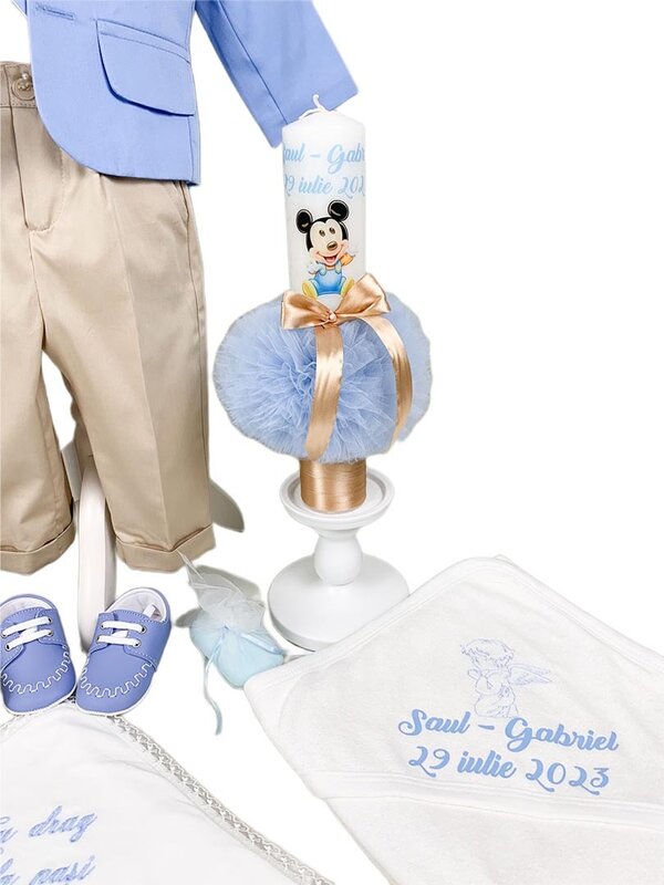 - Lumanarea pentru botez este confectionata cu atentie la detalii, aduce o nota de lumina si binecuvantare in viata micutului tau. Decorata cu elemente elegante si simbolice, aceasta va fi o amintire pretioasa din ziua botezului. Este decorata cu tul si fundita satinata pentru un plus de eleganta si este personalizata cu personajul "Mickey Mouse", numele si data nasterii insa personalizarea poate fi facuta in functie de preferinte.