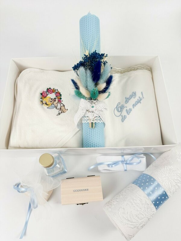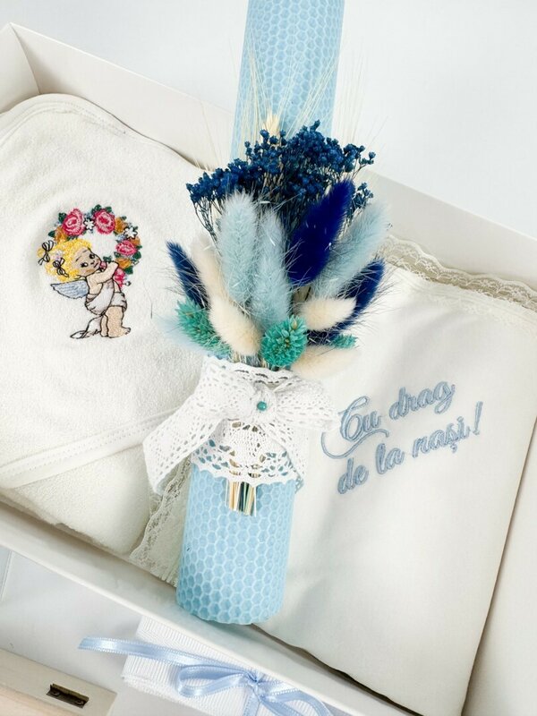 - Lumanare personalizata – Realizata din ceara naturala, cu ardere curata, decorata manual cu flori uscate in nuante de albastru, adaugand un detaliu elegant ceremoniei.