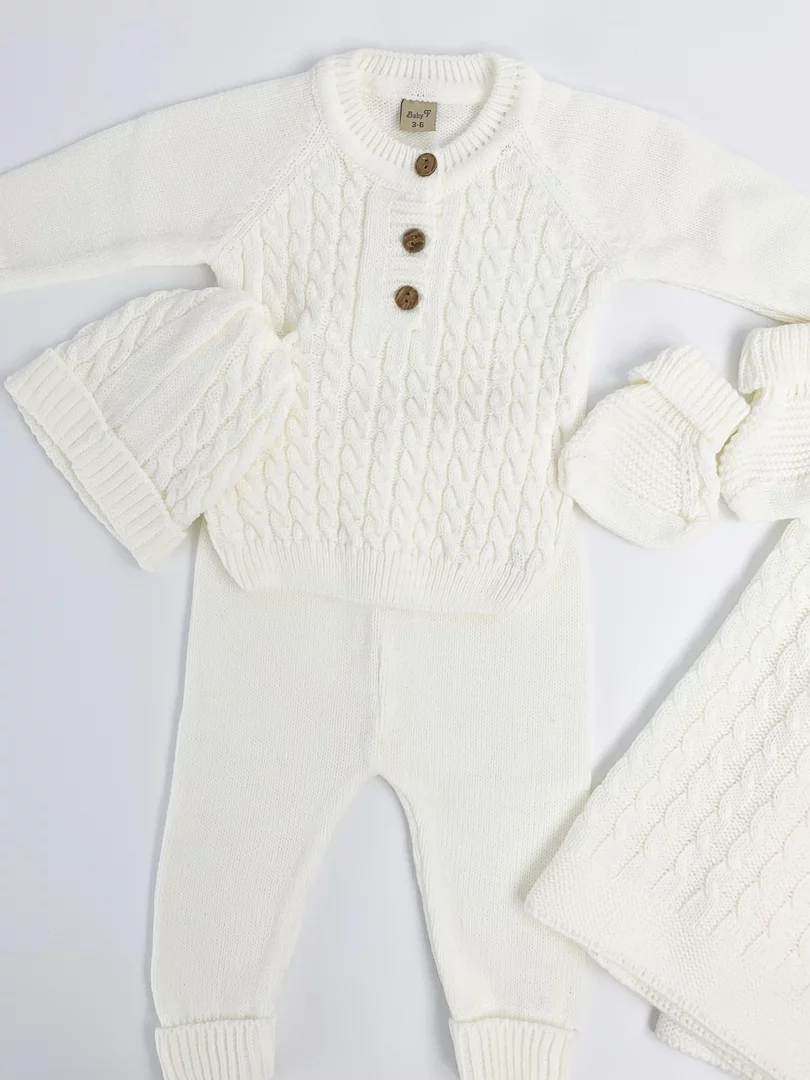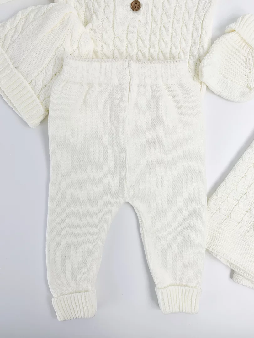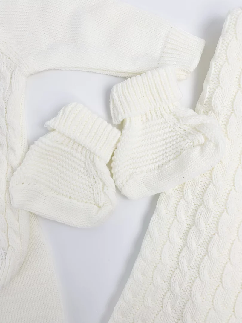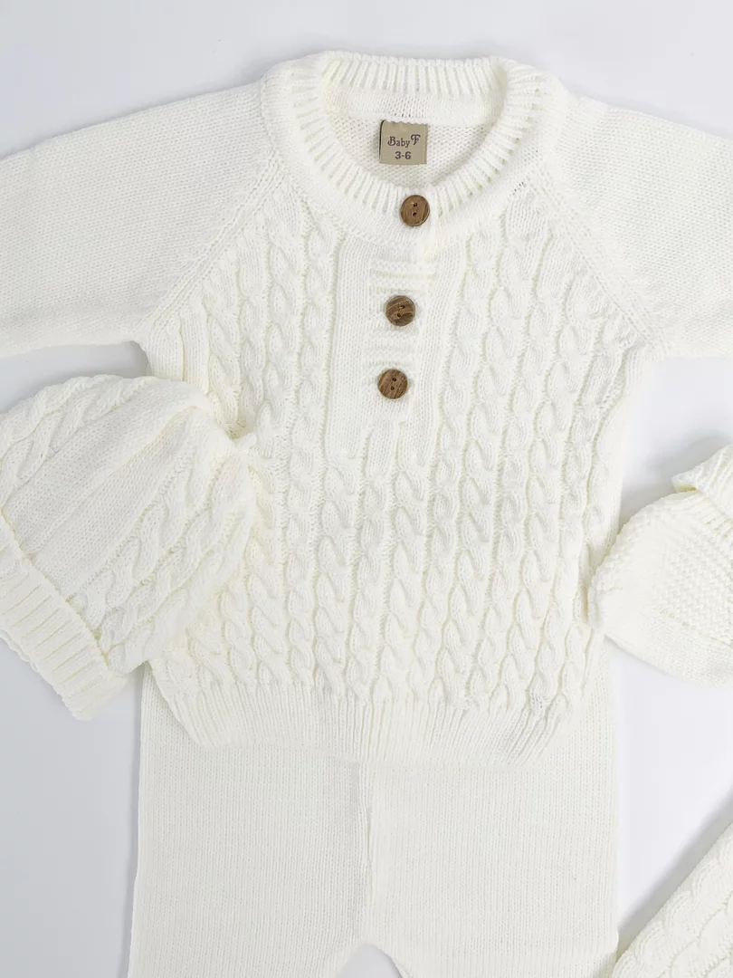Confectionat dintr-un tricot gros si moale, acest set hainute pentru bebelusi este creat pentru a oferi caldura si protectie in sezonul rece, fiind totodata elegant si practic.