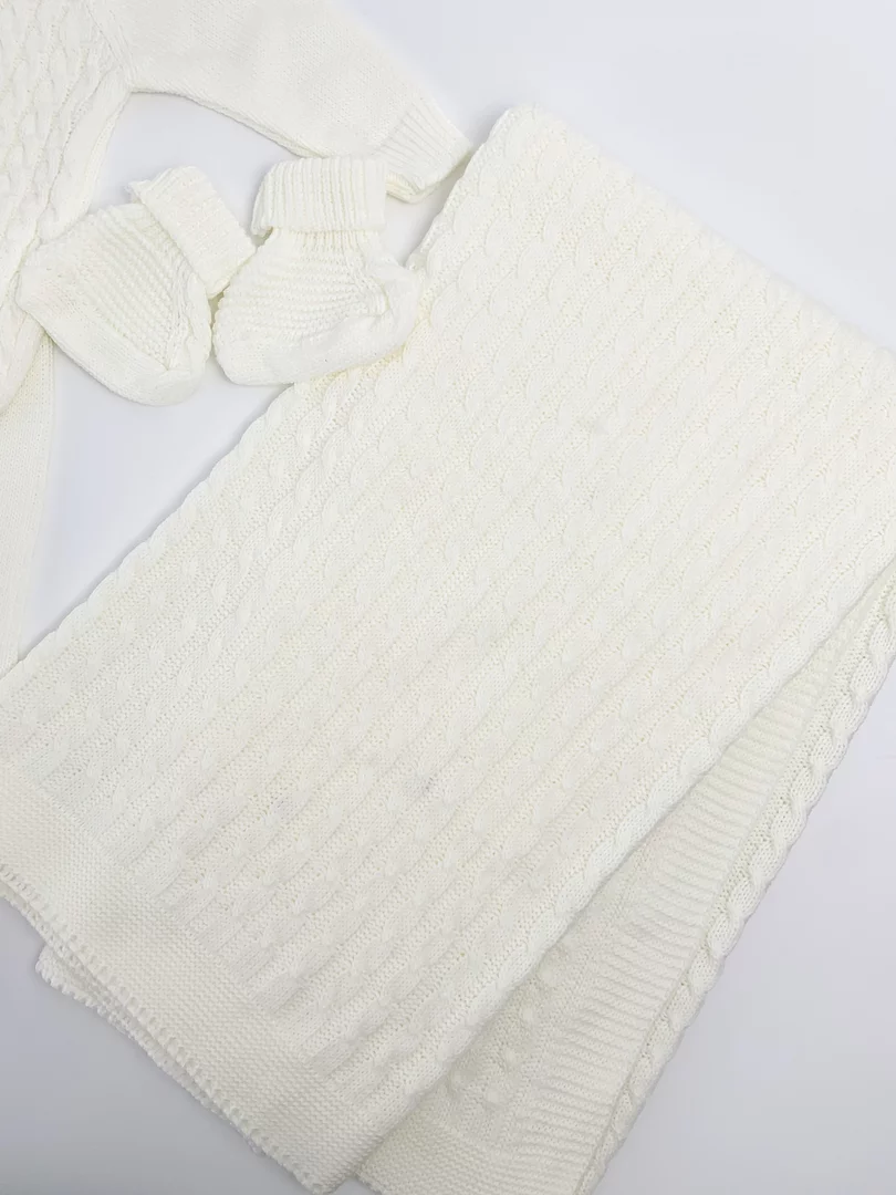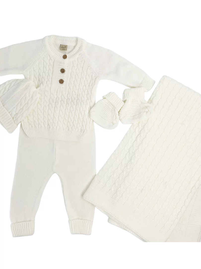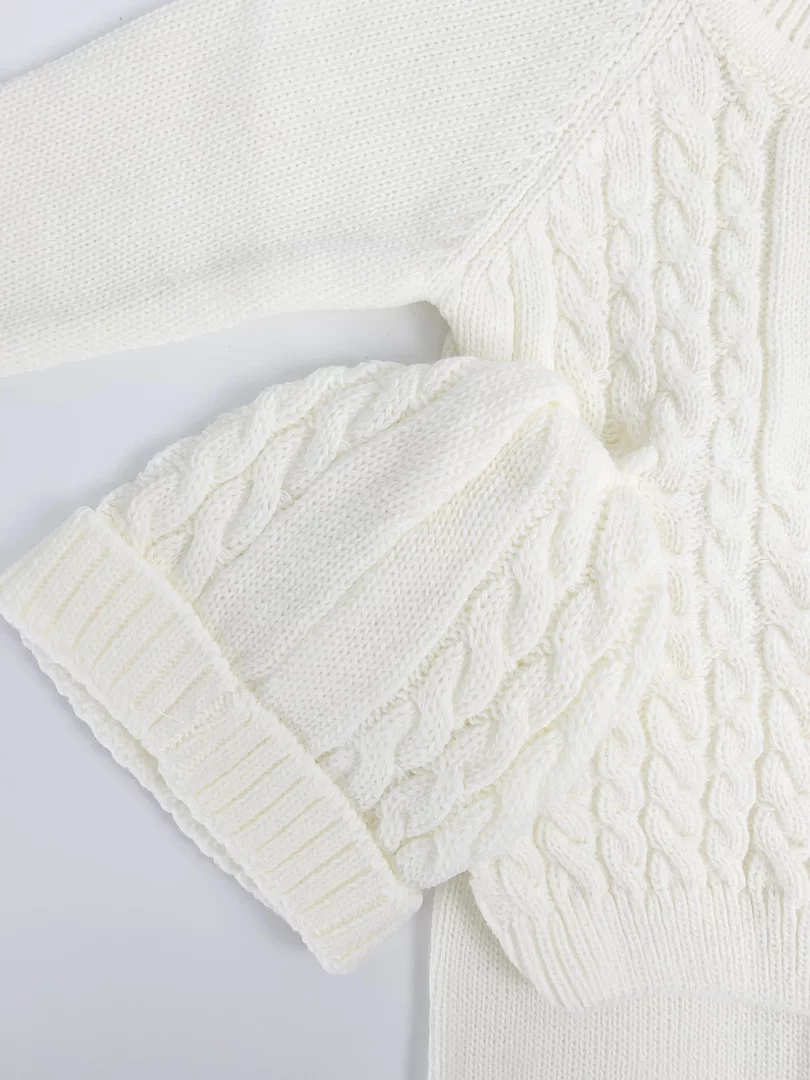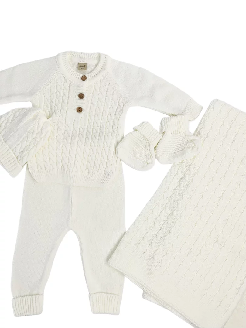 Confectionat dintr-un tricot gros si moale, acest set hainute pentru bebelusi este creat pentru a oferi caldura si protectie in sezonul rece, fiind totodata elegant si practic.