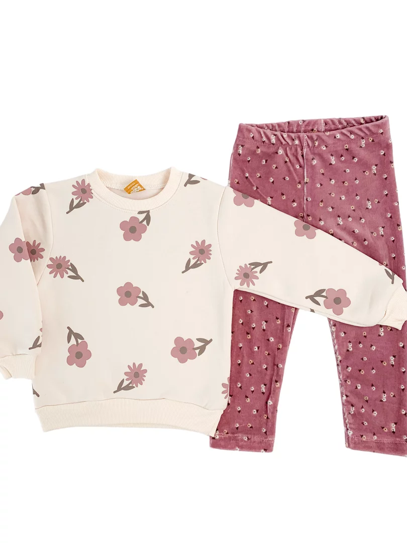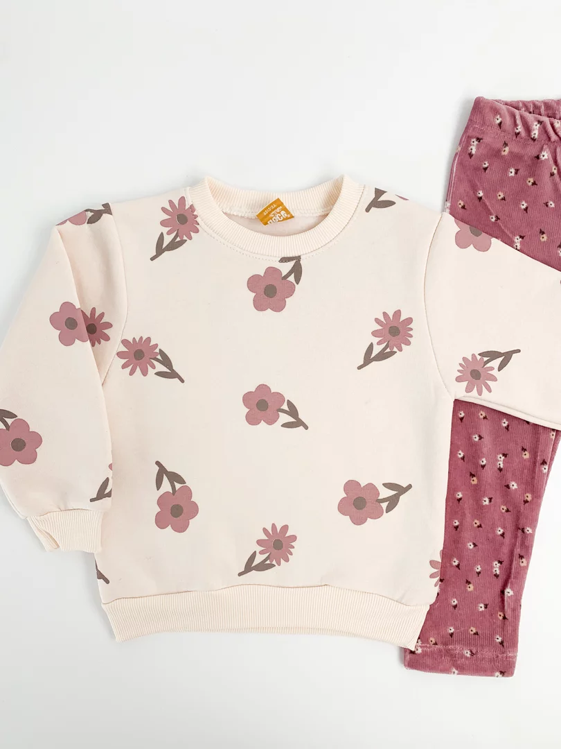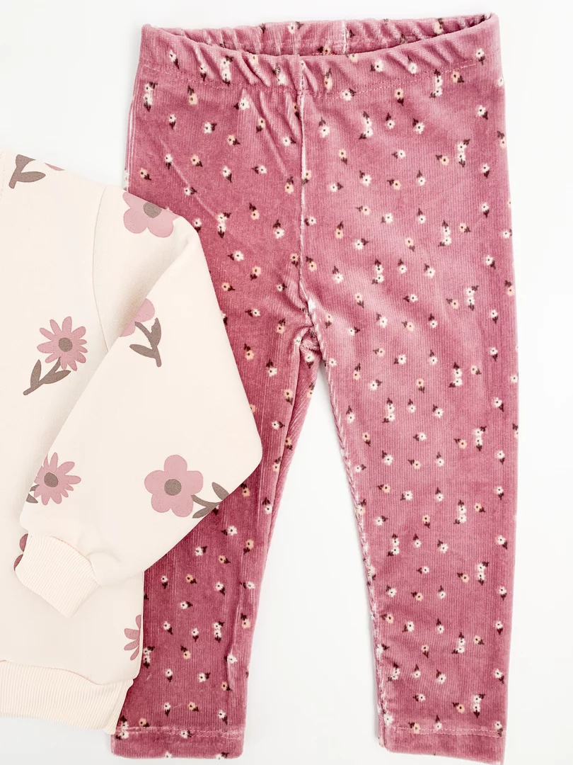Bluza cu maneci lungi este realizata dintr-un material calduros si are un imprimeu cu floricele, aducand un plus de farmec tinutelor de zi cu zi. Colantii elastici, prevazuti cu elastic in talie, asigura o potrivire confortabila si libertate deplina de miscare pe durata intregii zile.