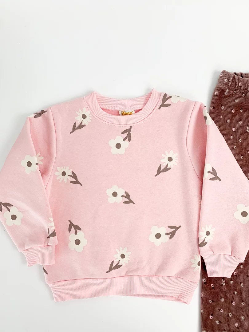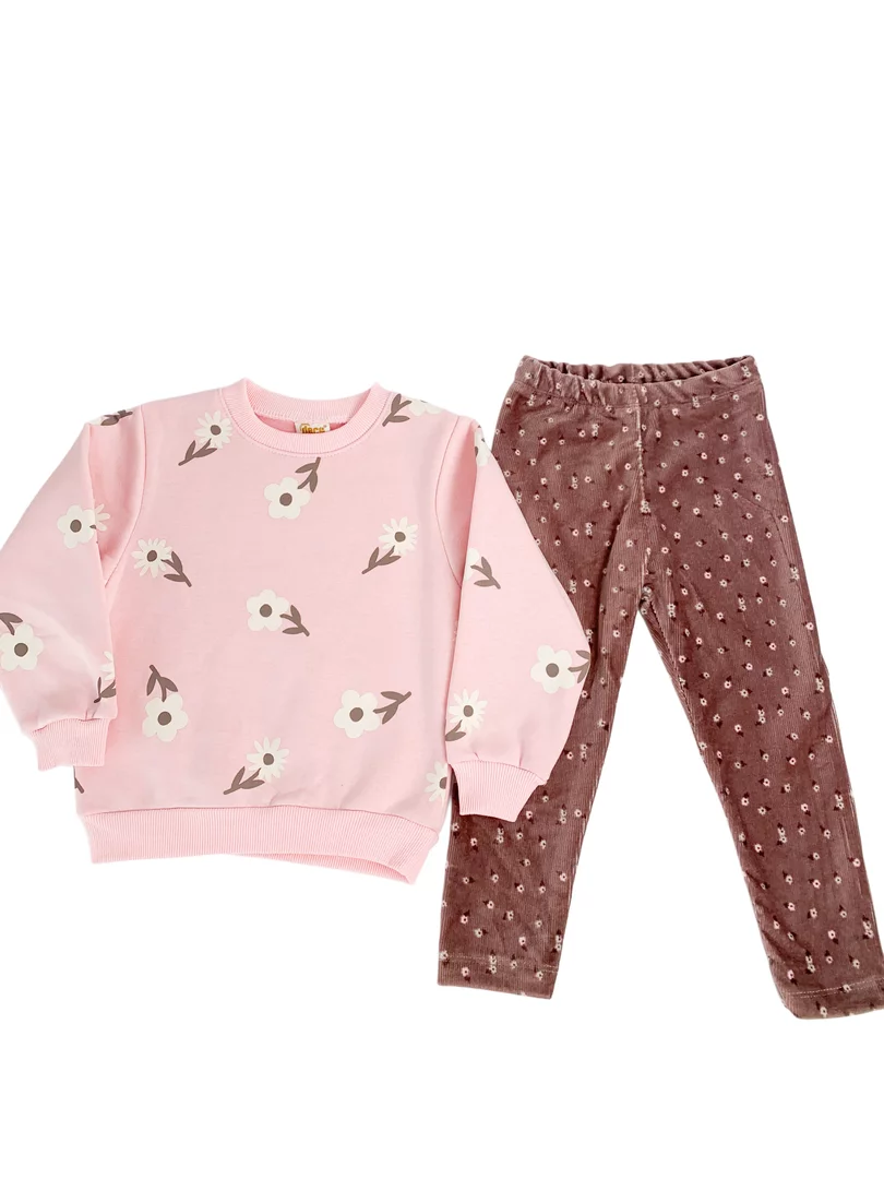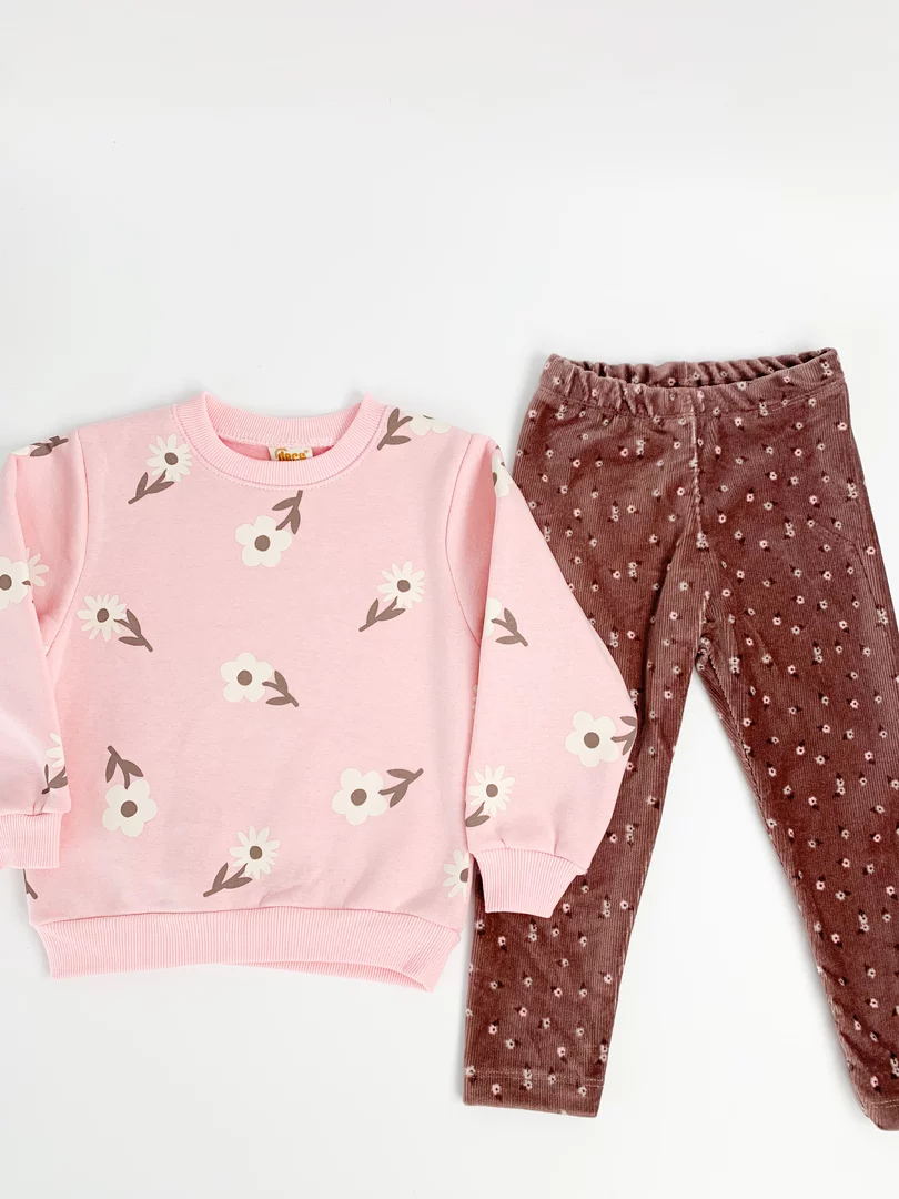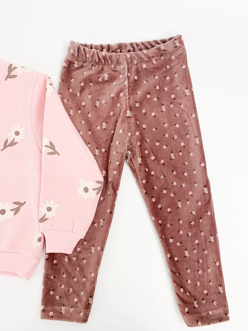 Bluzita groasa cu maneci lungi este decorata cu un imprimeu delicat cu floricele, oferind un aspect jucaus, iar colantii elastici cu elastic in talie asigura o potrivire perfecta si libertate de miscare pe durata intregii zile.