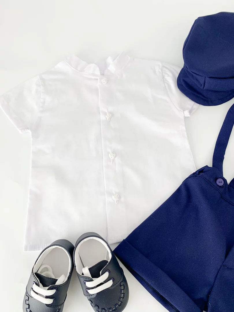 ✔ Camasa alba cu maneci scurte – Confectionata dintr-un material moale si placut la atingere, cu guler rotund si nasturi.