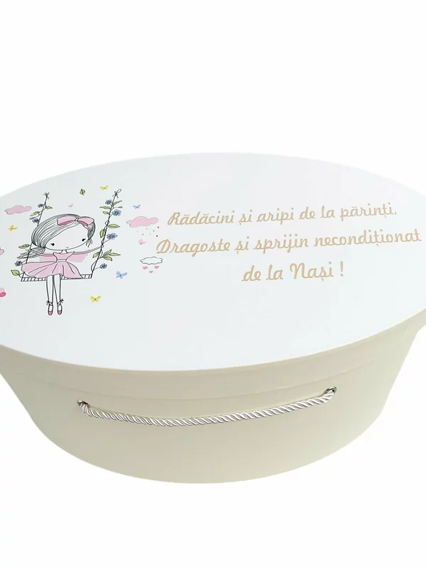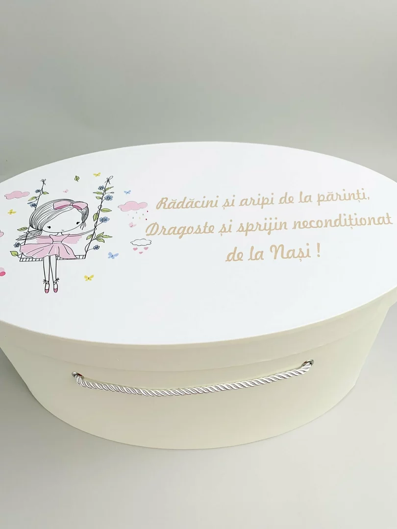 Acest cufar botez personalizat nu este doar un accesoriu util, ci si o amintire de suflet. Poate fi folosit ulterior pentru a pastra hainutele, jucariile sau primele amintiri ale bebelusului, ramanand un simbol al celei mai importante zile din viata sa.