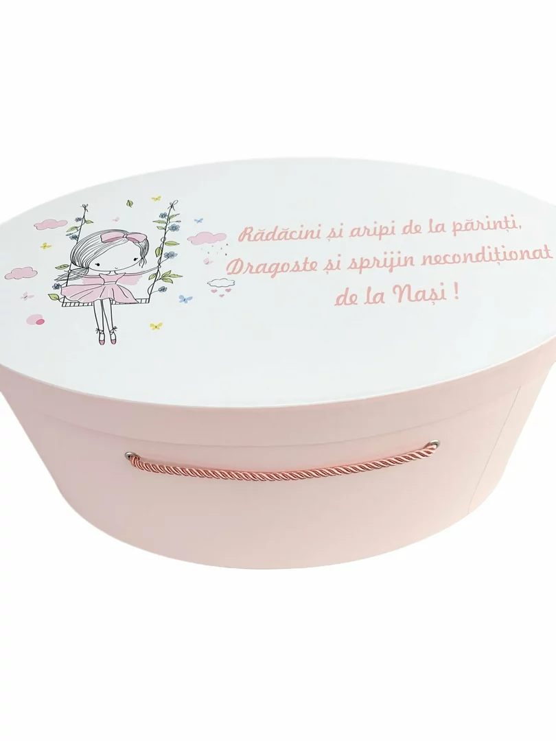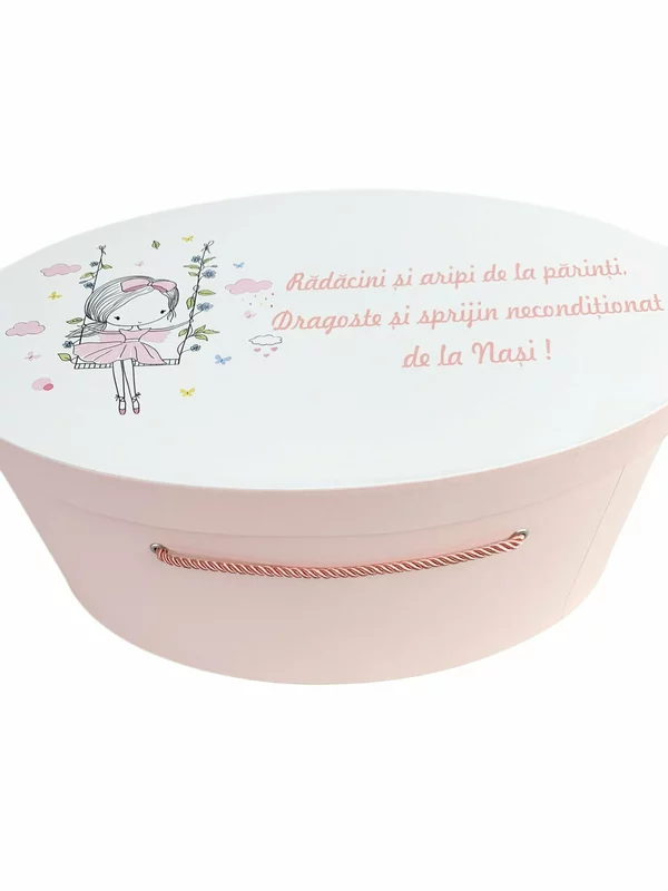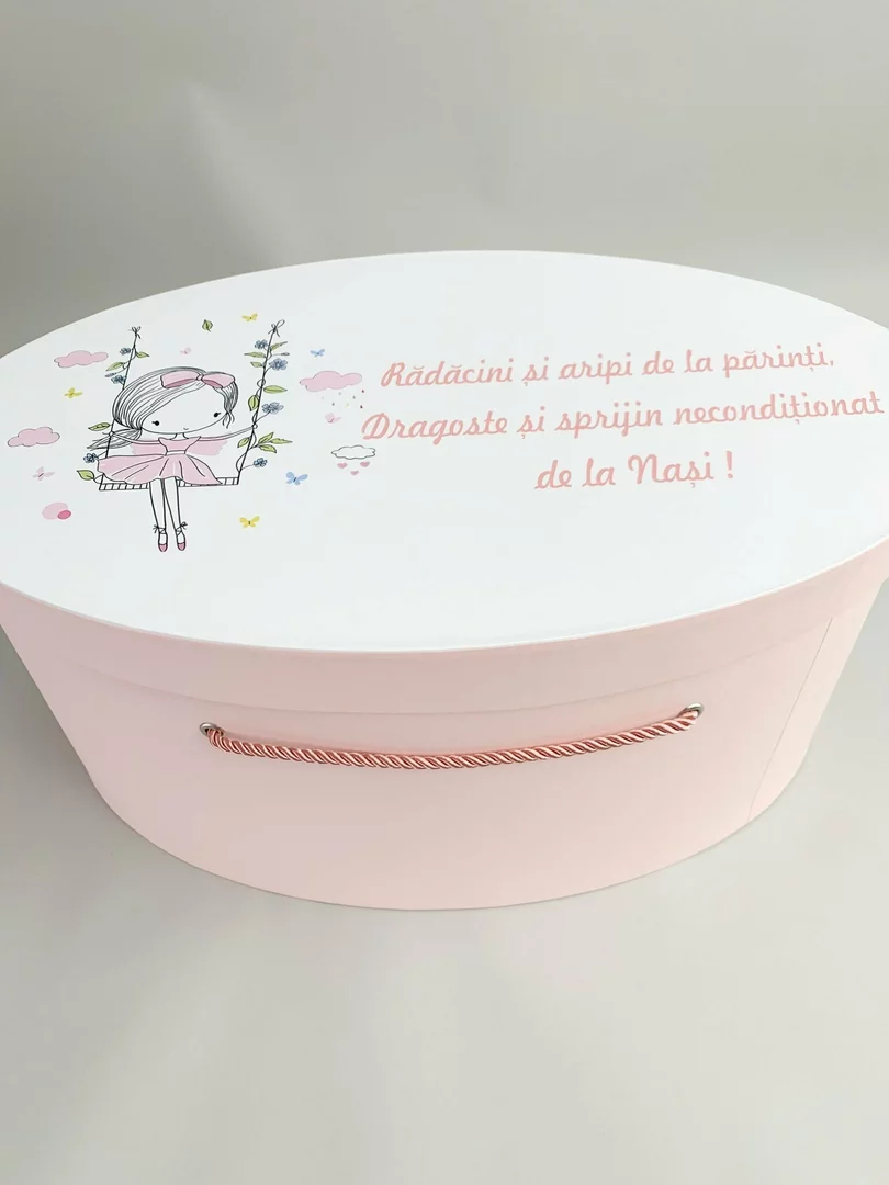 Acest cufar de botez personalizat este creat pentru a pastra in siguranta trusoul de botez si cele mai dragi amintiri ale micutei dumneavoastra!