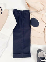- Pantaloni bleumarin ce completeaza perfect ansamblul, adaugand un aer proaspat si elegant.