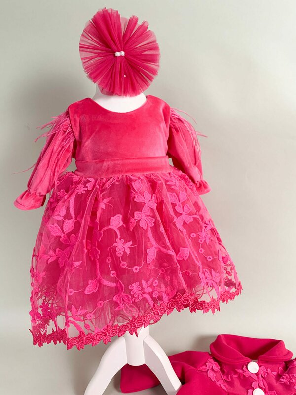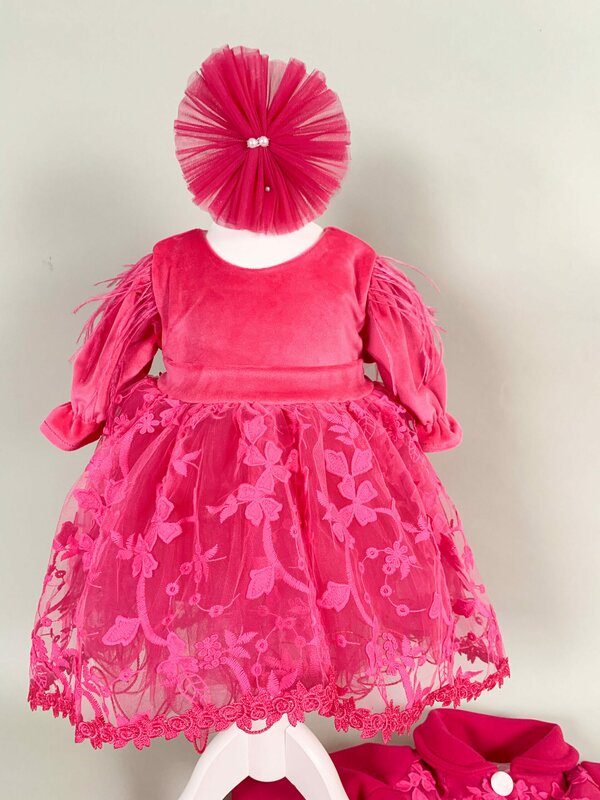 Pret unitar pe- Rochita roz - partea superioara a rochiei este confectionata din catifea, onferindu-i un aspect sofisticat. Fusta este ampla si realizata din tul, cu broderii delicate, care adauga o nota de eleganta si farmec. Manecile lungi cu pene aplicate sunt un detaliu deosebit, perfecte pentru a completa aspectul.
