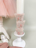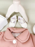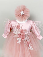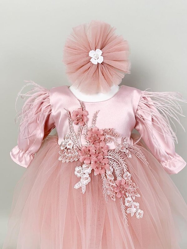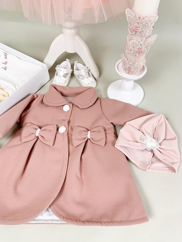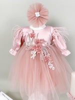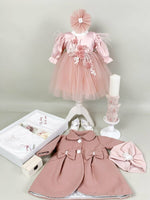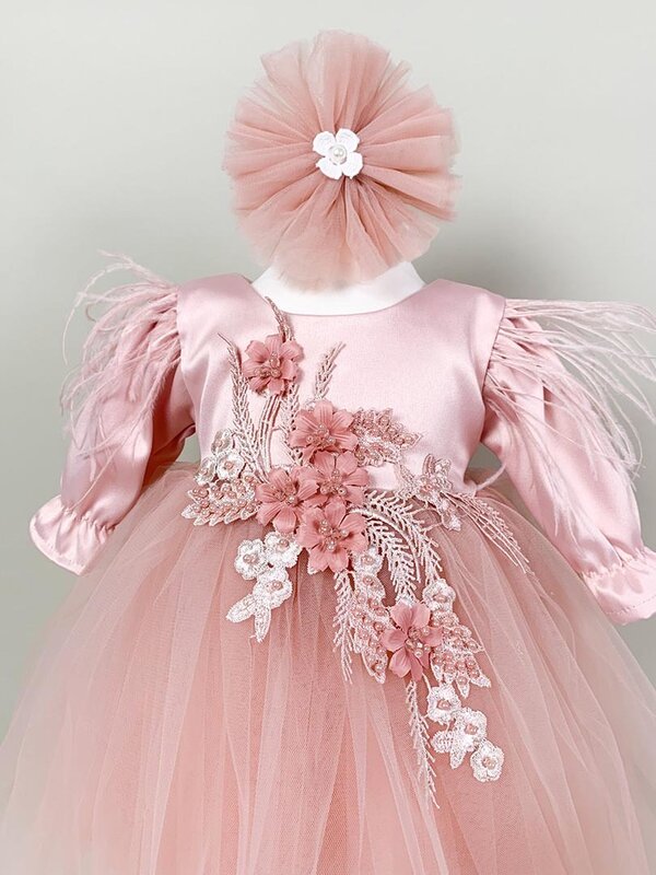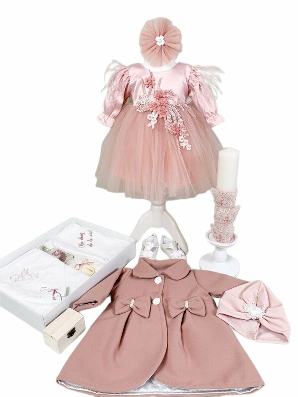 - Rochita - este creata intr-o nuanta roz pudrat si aduce o nota de eleganta intregii tinute. Pe partea superioara a rochitei se remarca aplicatii din dantela brodata, flori si perlute ce confera un aspect stralucitor si sofisticat. Manecile lungi cu pasmanterie subliniaza eleganta.