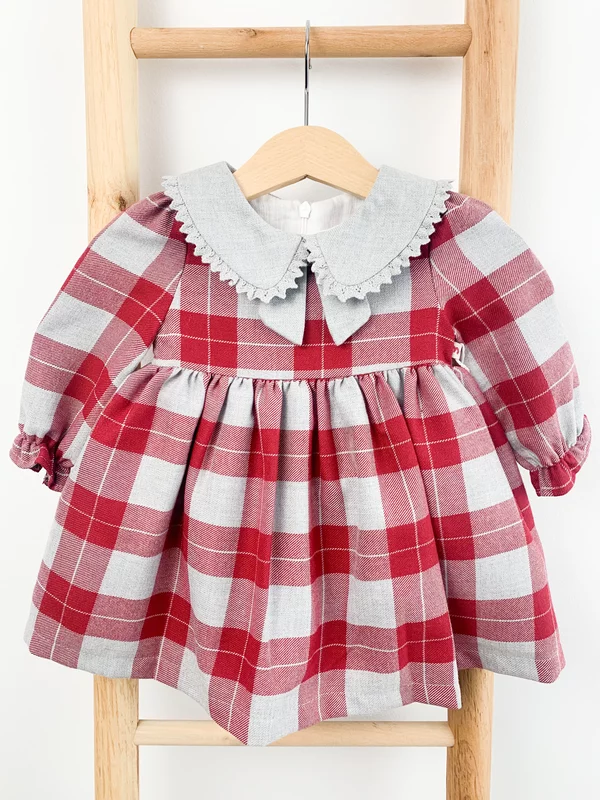 Cromatica festiva in nuante de rosu si gri transforma rochita in alegerea perfecta pentru sarbatorile de iarna, fotografii tematice sau ocazii speciale. Gulerul mare si rotund, decorativ, impreuna cu manecile lungi, completeaza perfect tinuta pentru sezonul rece.