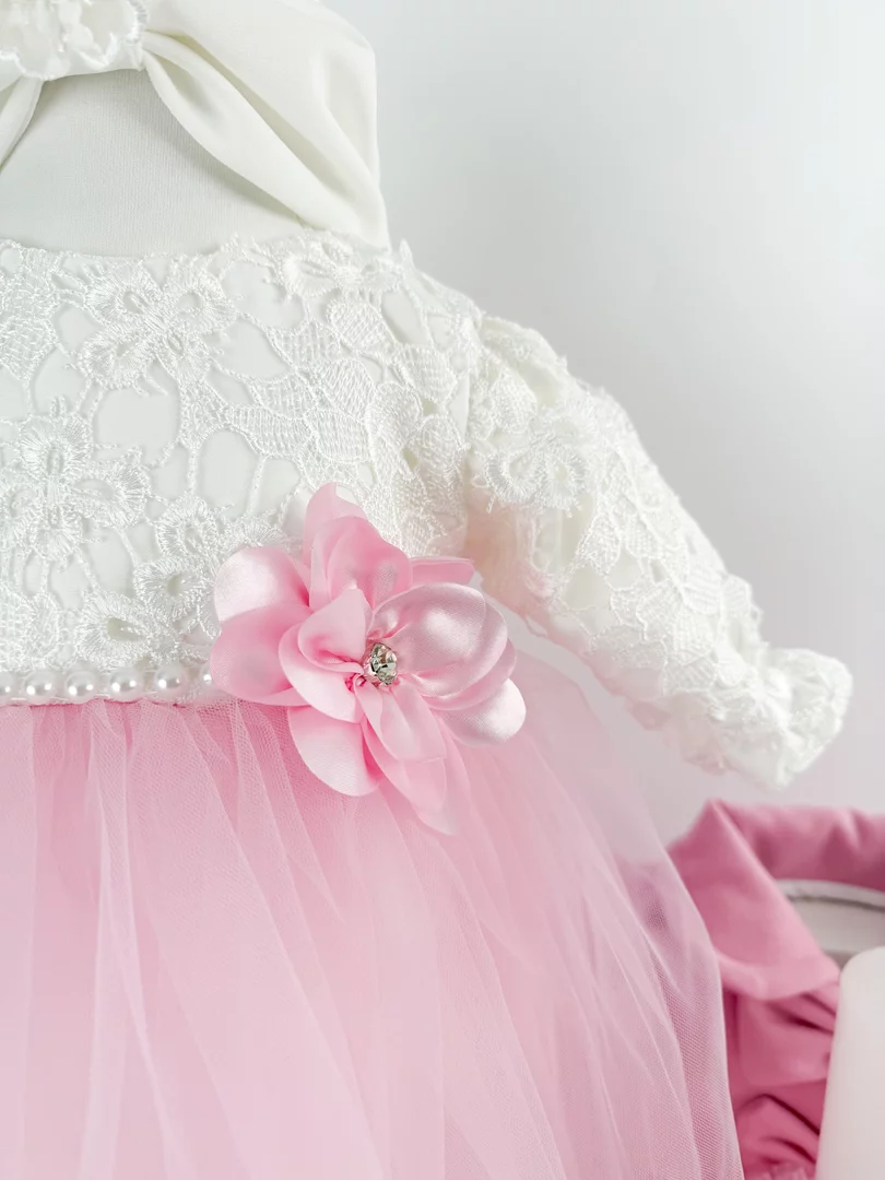 - Rochita cu dantela si fustita ampla - Rochita este captusita cu bumbac moale si decorata cu dantela brodata aplicata. La talie are un sirag de perle cu floricica, iar fustita ampla si vaporoasa din tul adauga un plus de eleganta. Se inchide cu fermoar si cordon la spate si are maneci lungi pentru o purtare confortabila si practica.