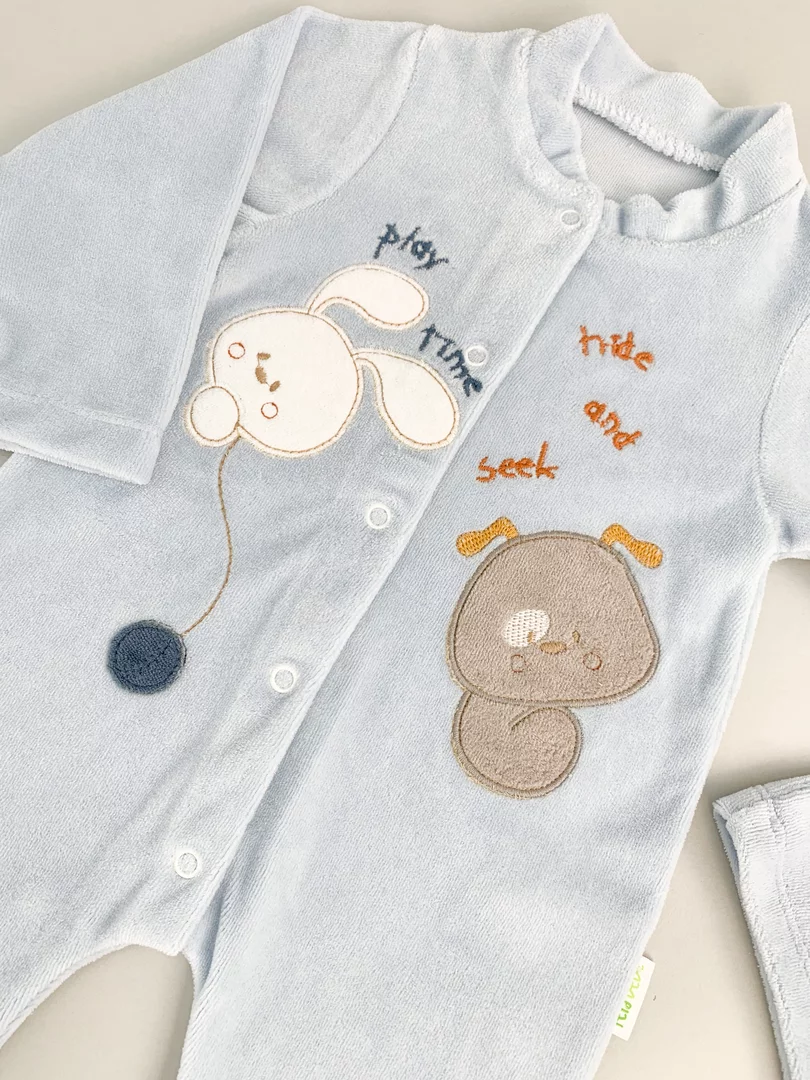 Salopeta albastra pufoasa baiat cu catelus si iepuras