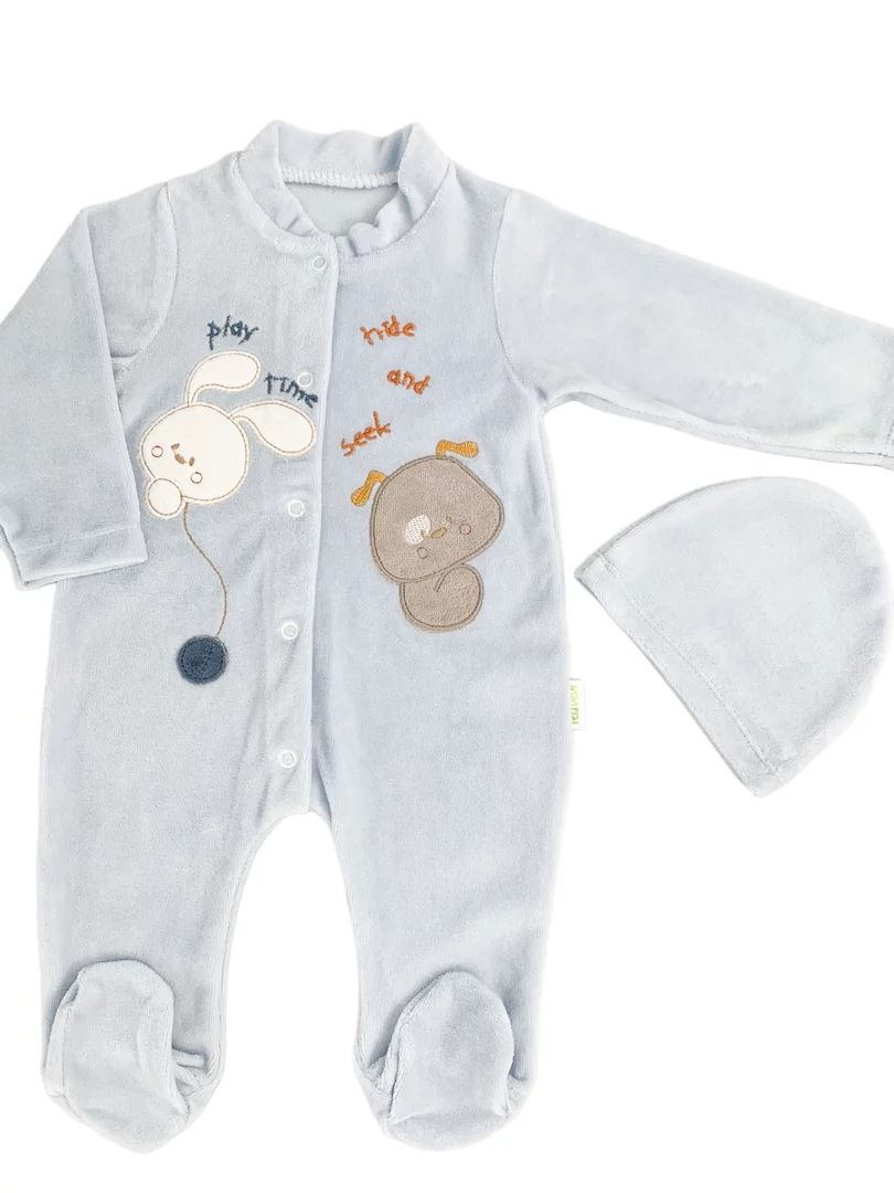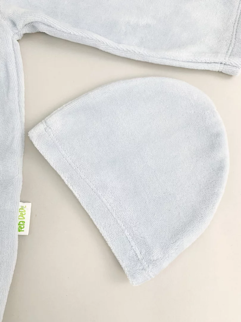 Aceasta salopeta albastra pentru bebelusi cu caciulita este ideala pentru plimbari in aer liber, joaca, somn sau pentru a fi oferita cadou, fiind atat practica, cat si eleganta.