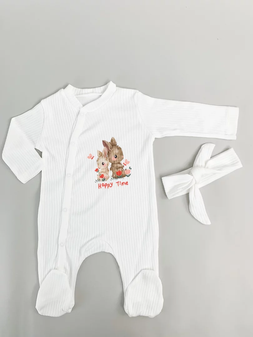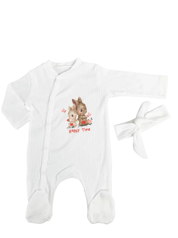 Modelul este decorat cu un imprimeu adorabil cu iepurasi, iar sistemul de inchidere cu capse faciliteaza schimbarea rapida. Setul este completat de o bentita din acelasi material, perfecta pentru a mentine caldura corpului.