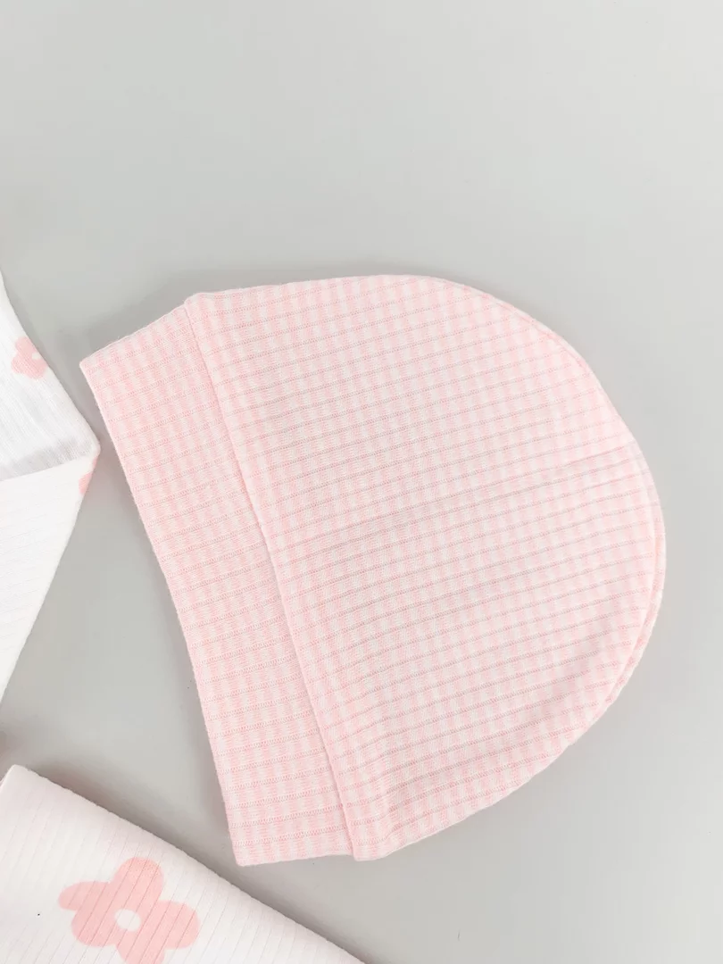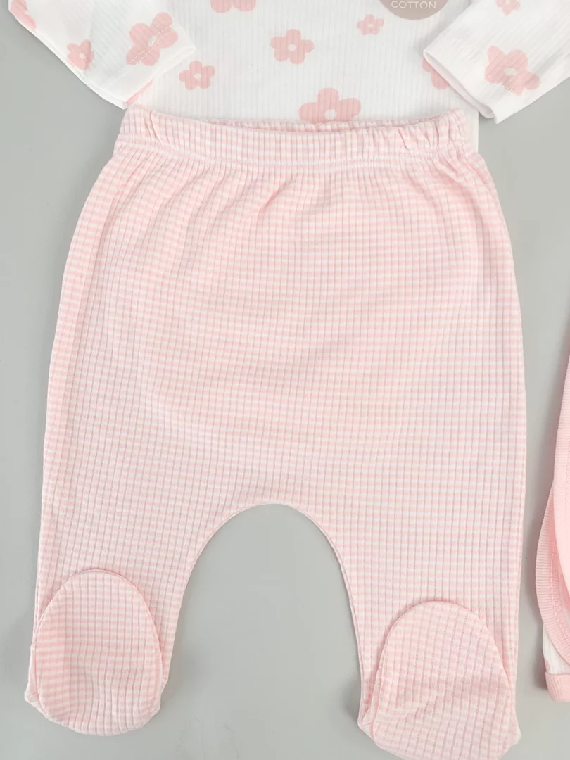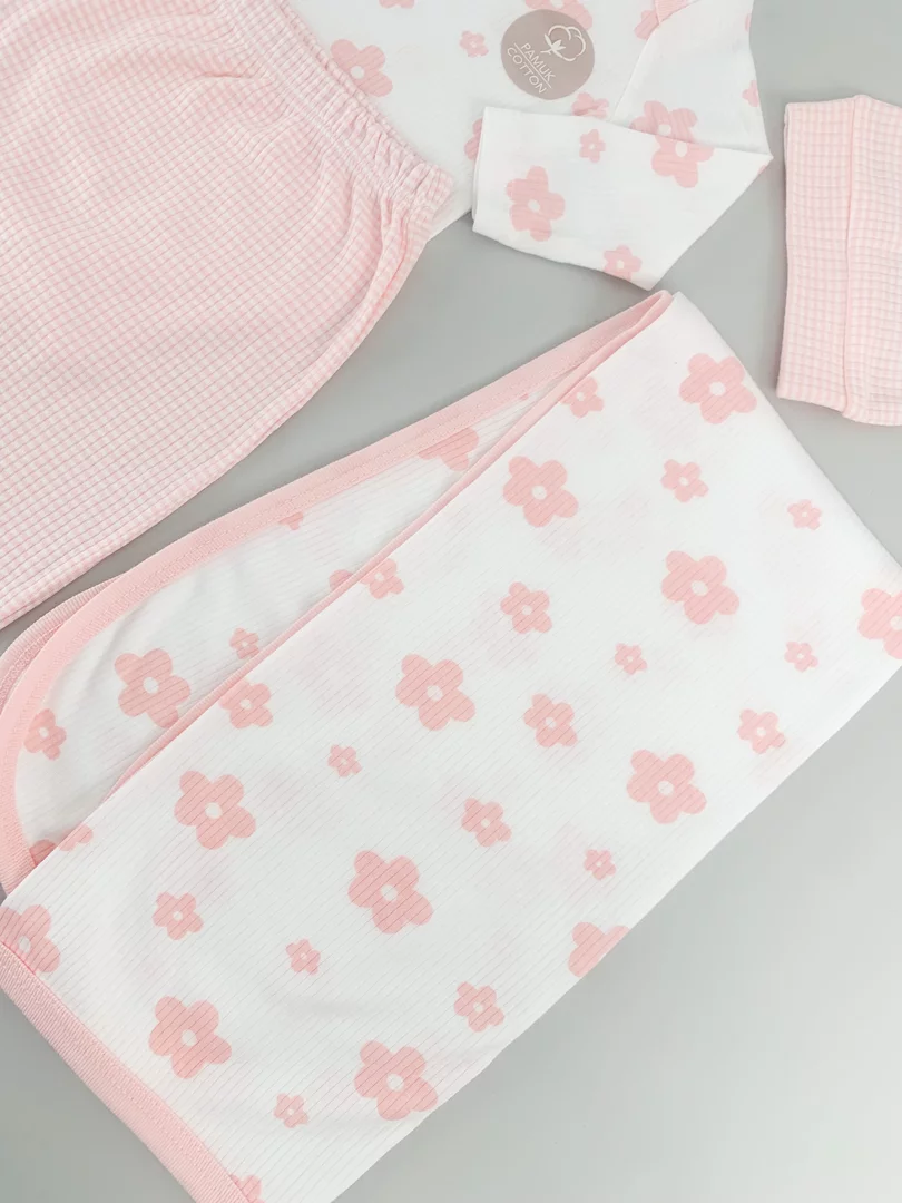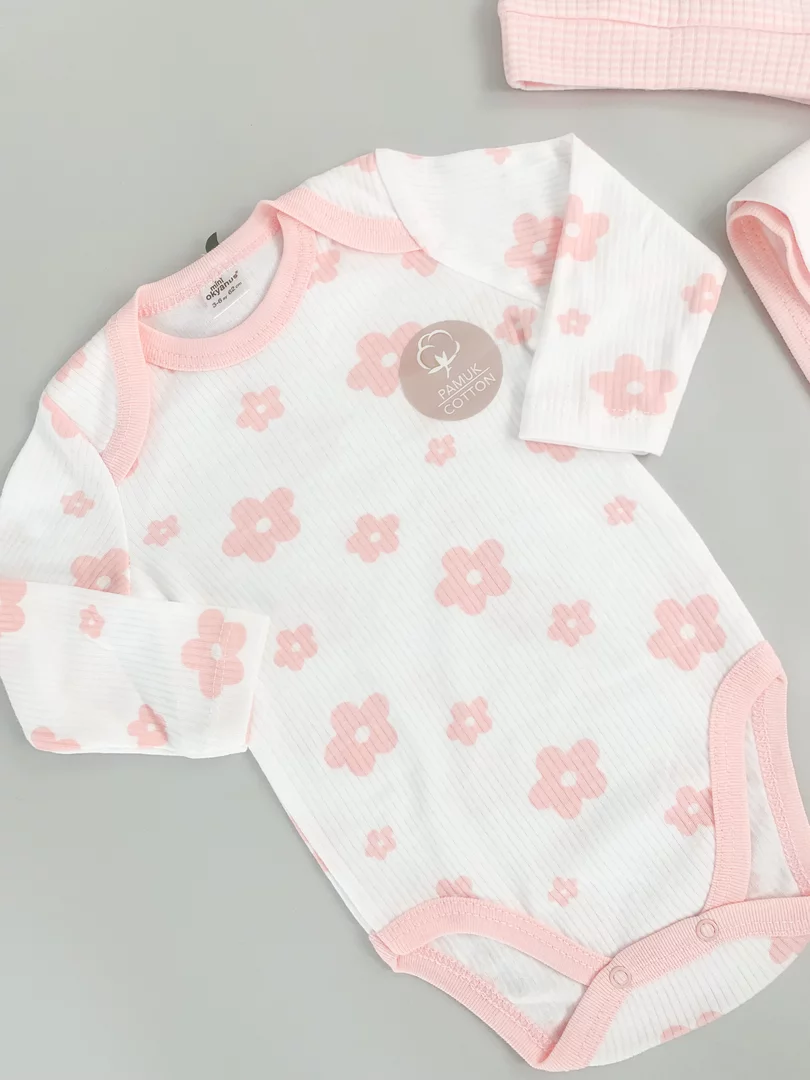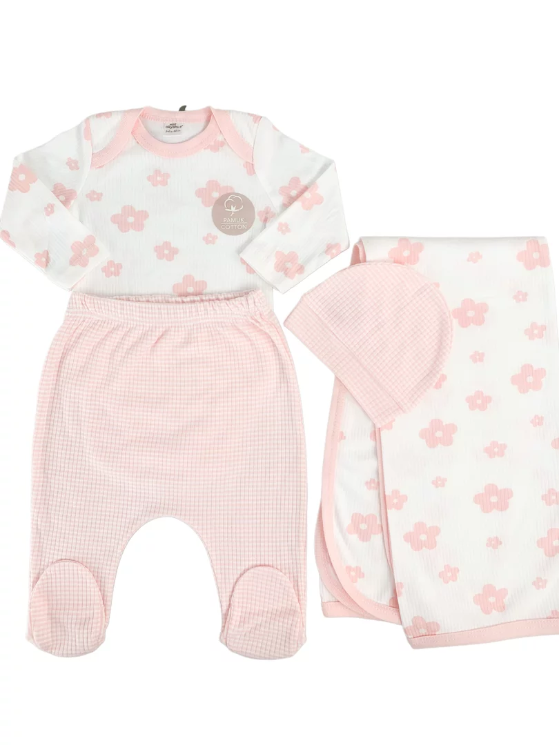 Setul include un body alb cu floricele, cu maneci lungi si capse pentru schimbare usoara, pantalonasi comozi cu elastic, o caciulita pufoasa si elastica, precum si o paturica moale si calduroasa, perfect asortata cromatic.