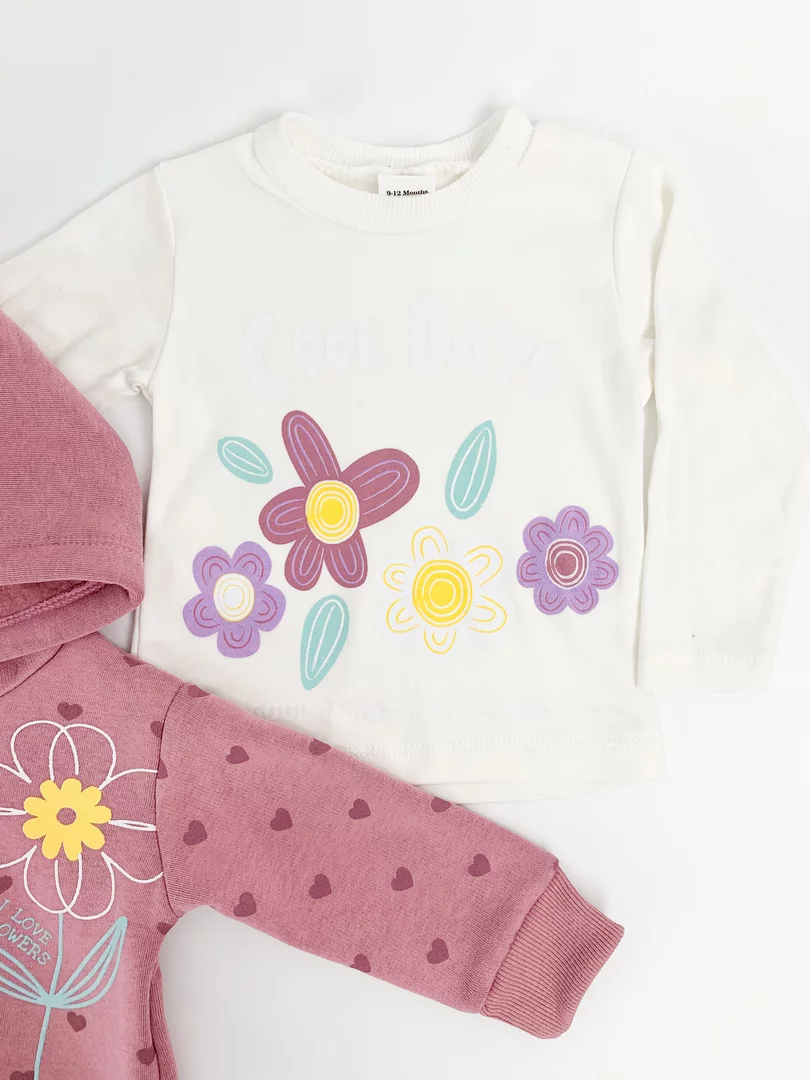 Pantalonii comozi, cu elastic in talie si mansete la picioruse, sunt perfecti pentru libertate de miscare, iar bluzita lejera cu maneci lungi, guler rotund si imprimeu jucaus cu flori completeaza armonios setul.