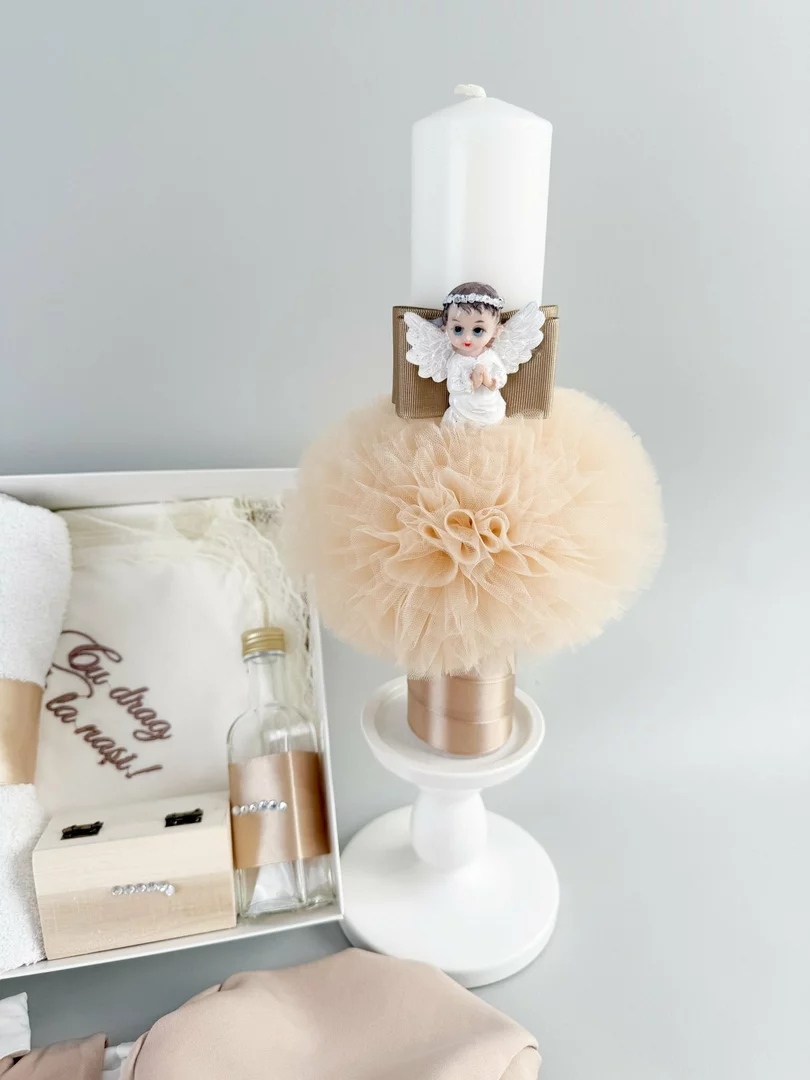 ✔ Lumanare botez personalizata cu tul si figurina ingeras – Realizata din ceara naturala si decorata manual, aceasta lumanare simbolizeaza lumina si puritatea ceremoniei, fiind un element central al momentului sacru.