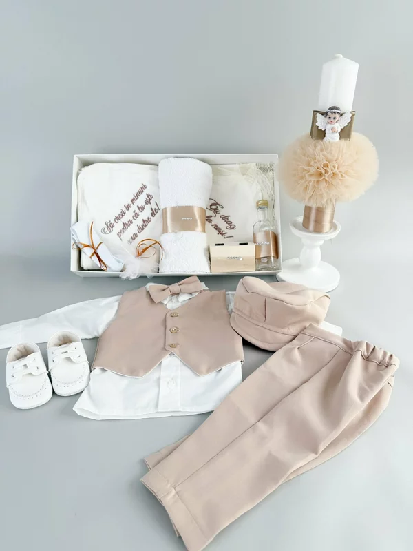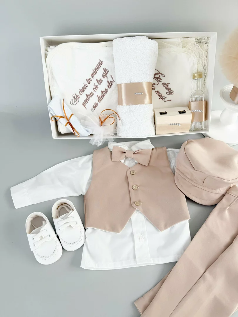 ✔ Vesta crem captusita – Un element clasic, care completeaza perfect costumul de botez pentru baieti, oferind un aspect festiv si elegant.